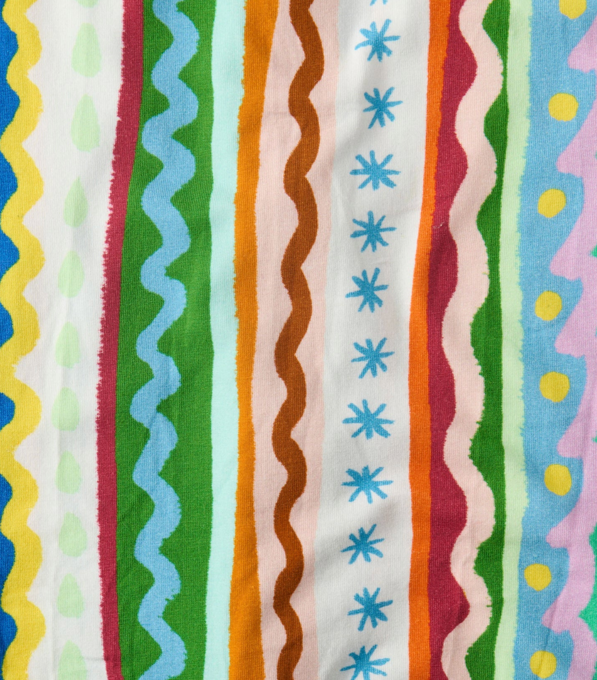 Whether it’s nap time, playtime or out-and-about time, this romper’s ready to roll! This stripey number featuring columns of lines, squiggles and star spotted patterns in a rainbow of colours.