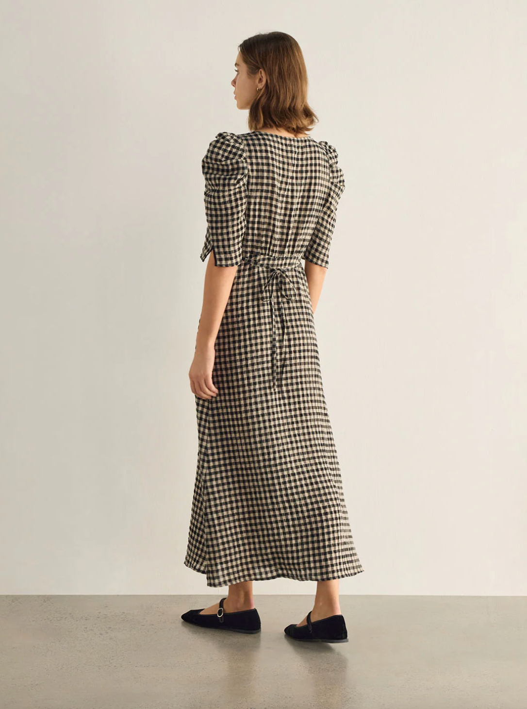 The Bennett Midi Dress is an everyday essential, crafted from lightweight cotton and linen seersucker for a casual, textured feel. Featuring a flattering V neckline, underbust seam with soft gathers, gigot elbow sleeves with hem splits, and a back waist tie, it’s an effortlessly wearable, feminine silhouette.