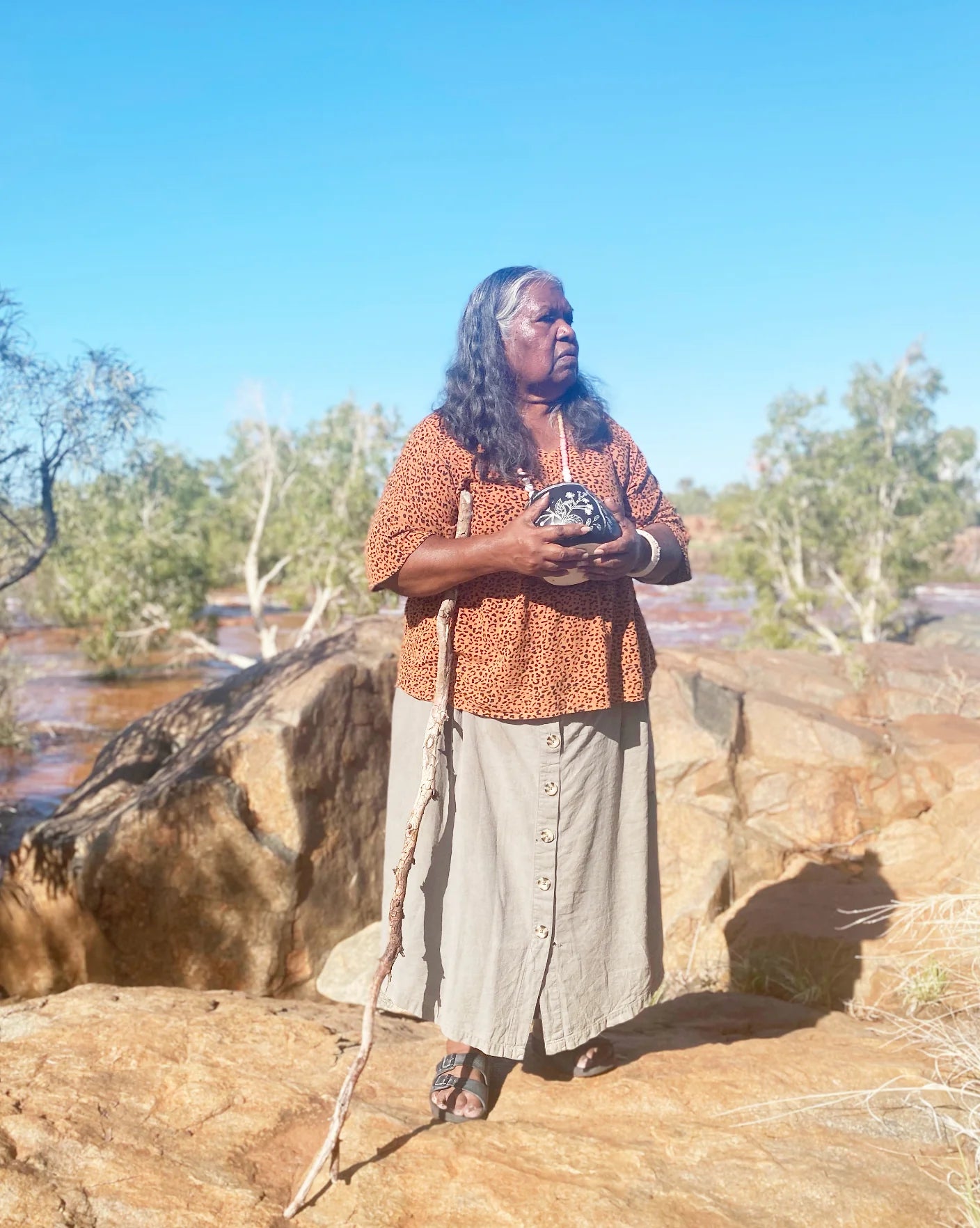 A celebration of culture, language, and pottery; the story of the Yindijbarndi people of the north-western Pilbara region of Western Australia. Jane Cheedy is a respected Yindijbarndi Elder, cultural custodian, linguist, and artist. Jane is dedicated to preserving and sharing the Yindijbarndi language, and has work for many years as a Yindijbarndi language teacher at both high and primary school levels. Jane's artwork often features written Yindijbarndi text, oral recordings of songs, and depictions of the Yindijbarndi plants, animals and important sites.