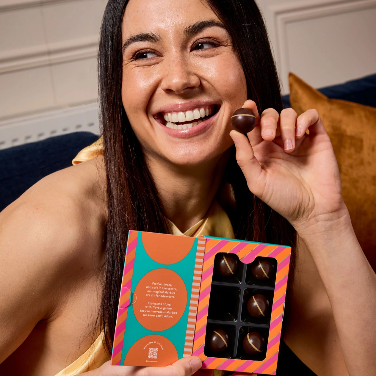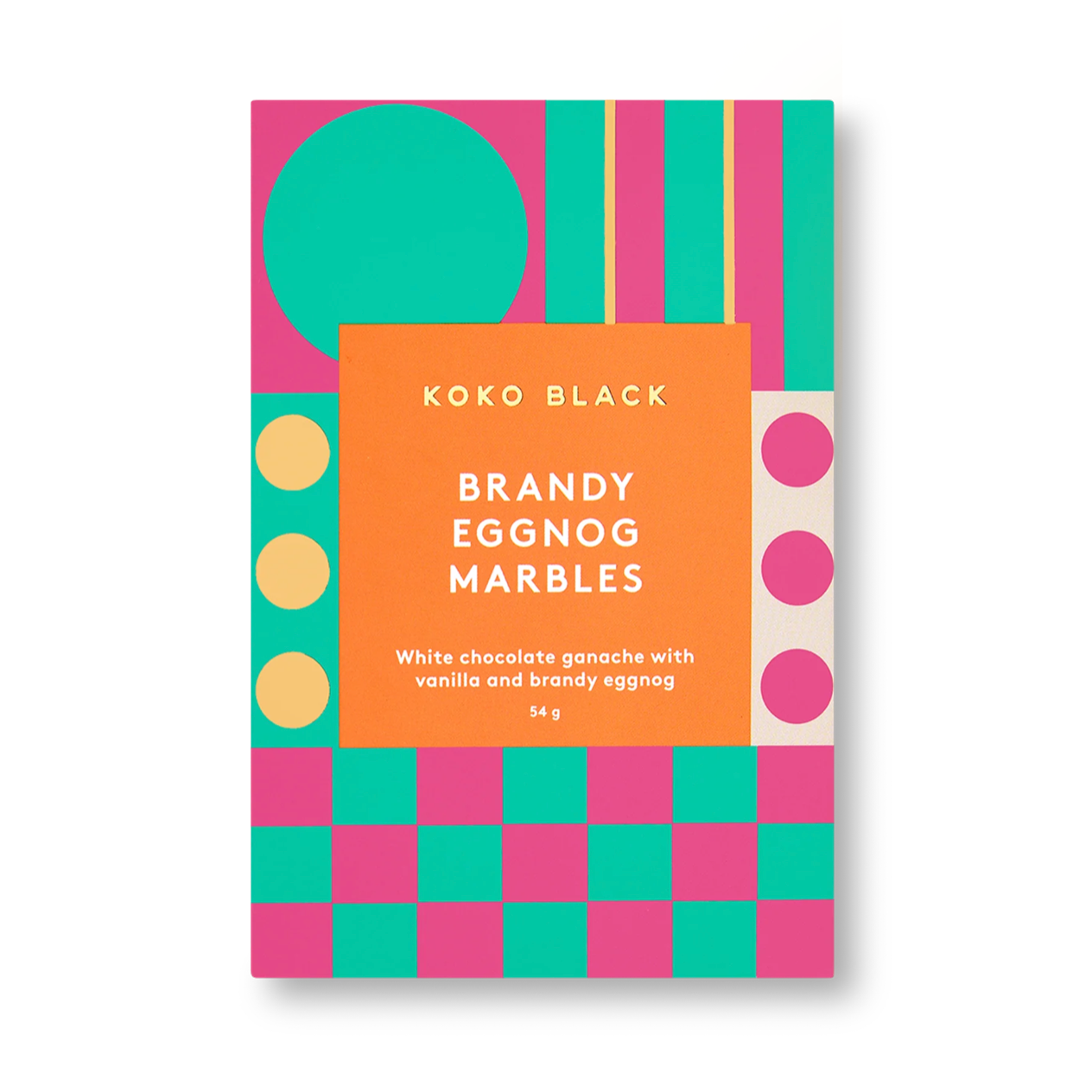 Decadent dark chocolate marbles with a smooth vanilla eggnog centre. Rich and