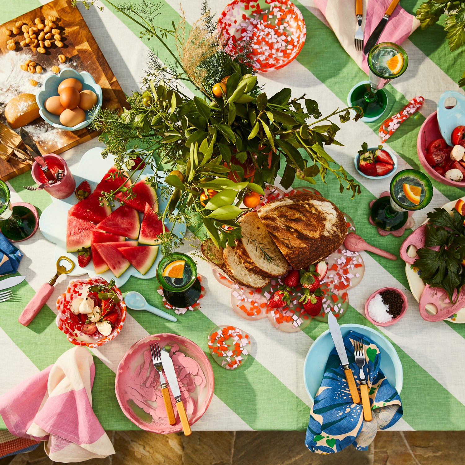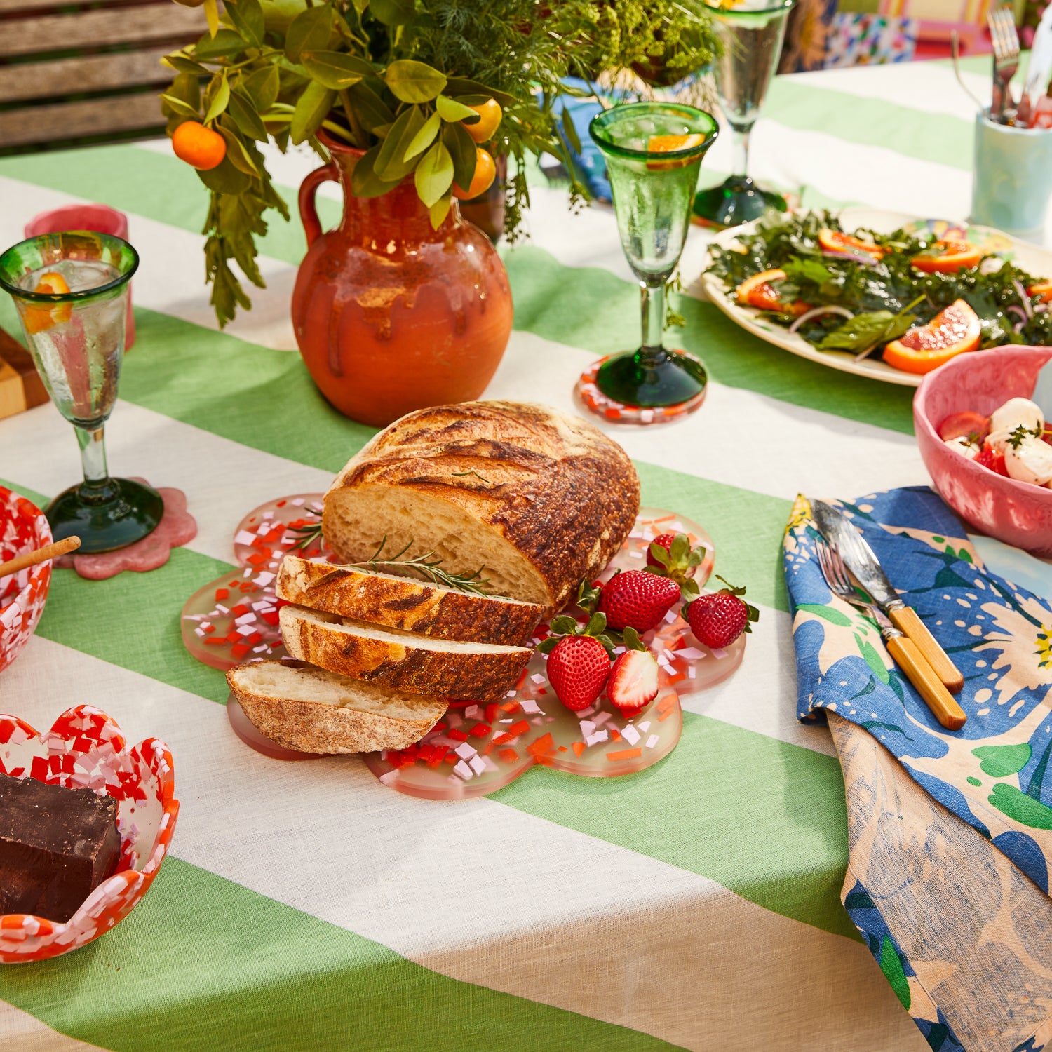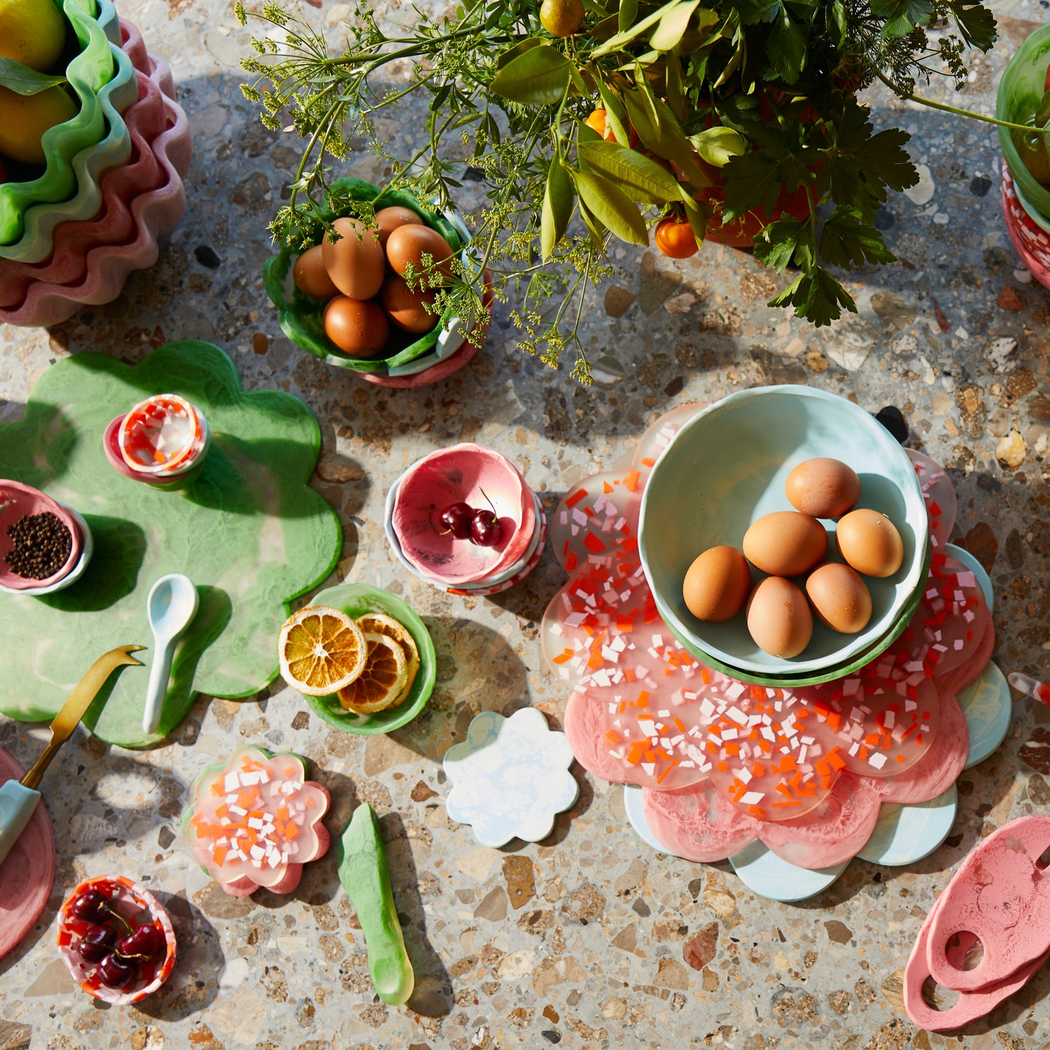 “Whether you’re entertaining or just enjoying daily dinners with the family, our resin tableware makes every meal an experience to remember. The Candice Board features scalloped edges to create a beautiful flower shape, bringing plenty of character and elegance to celebrations of all kinds. Imagined here in our stunning Confetti colourway – swirling together pops of pinks and orange with transparent resin to imitate classic terrazzo designs.” – Phoebe’s Style Notes