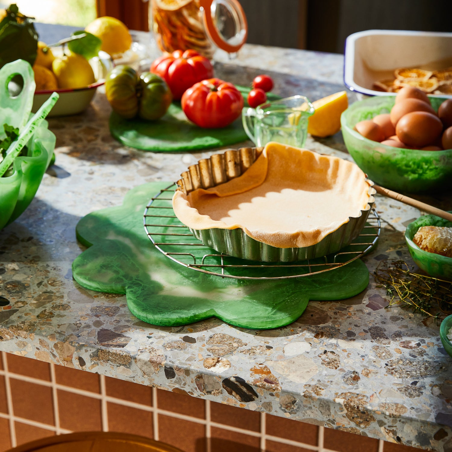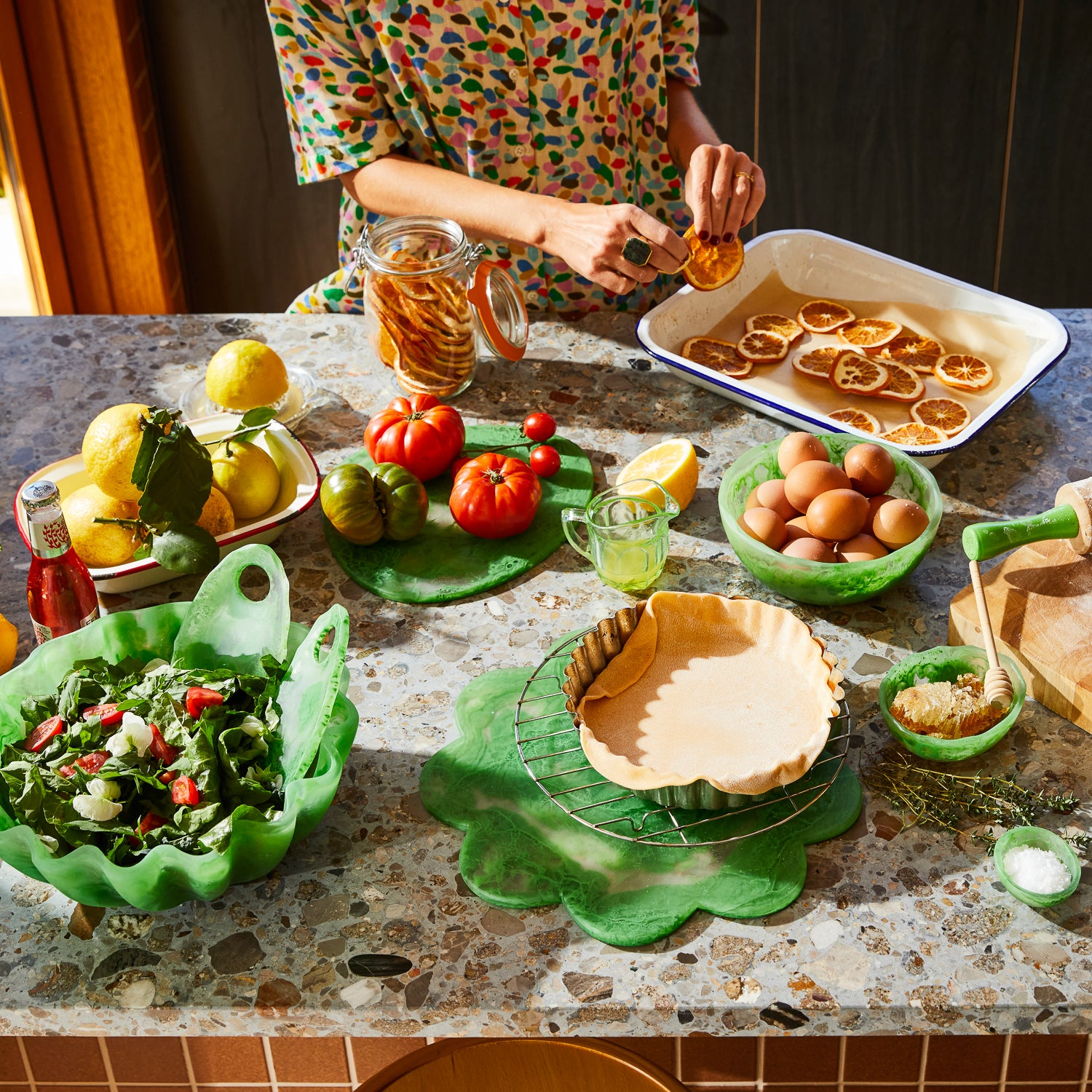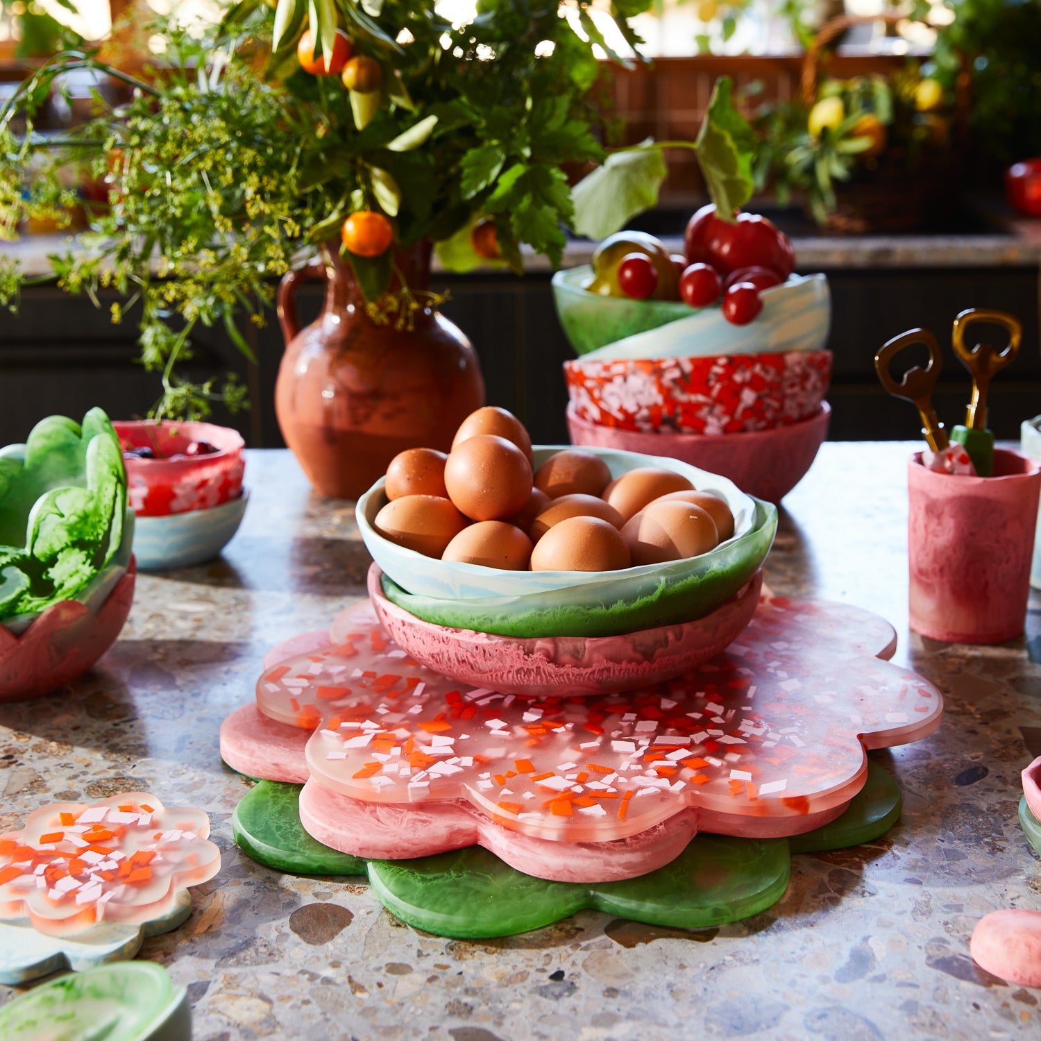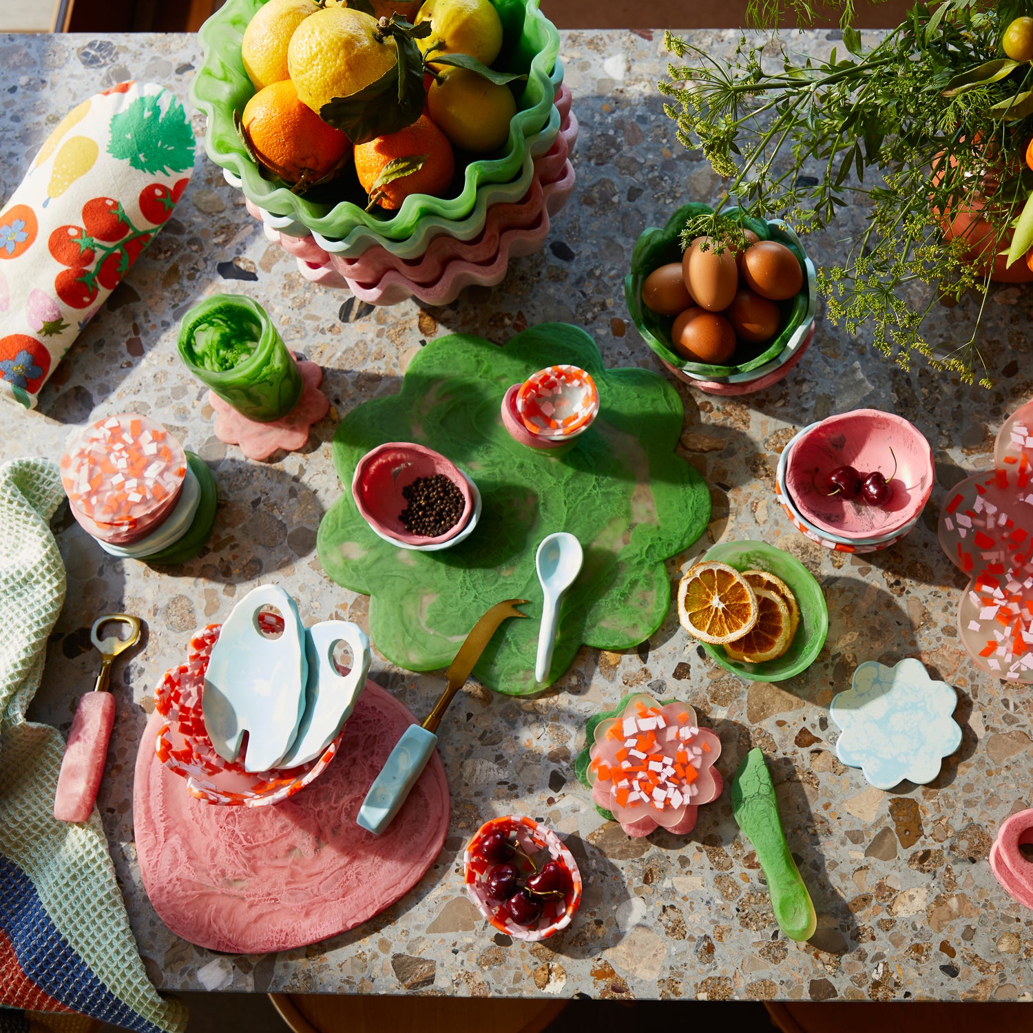 “Whether you’re entertaining or just enjoying daily dinners with the family, our resin tableware makes every meal an experience to remember. The Candice Board features scalloped edges to create a beautiful flower shape, bringing plenty of character and elegance to celebrations of all kinds. Imagined here in our stunning Confetti colourway – swirling together pops of pinks and orange with transparent resin to imitate classic terrazzo designs.” – Phoebe’s Style Notes