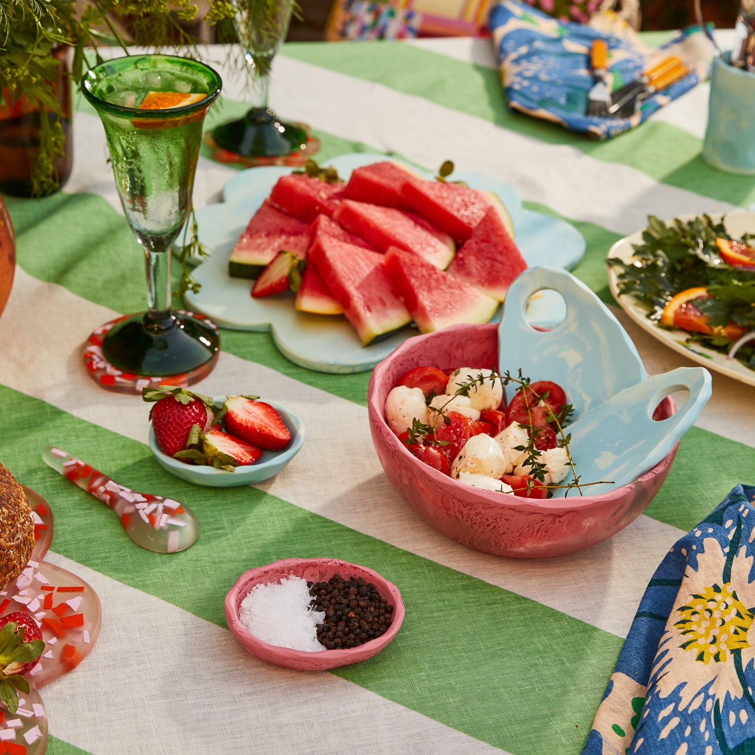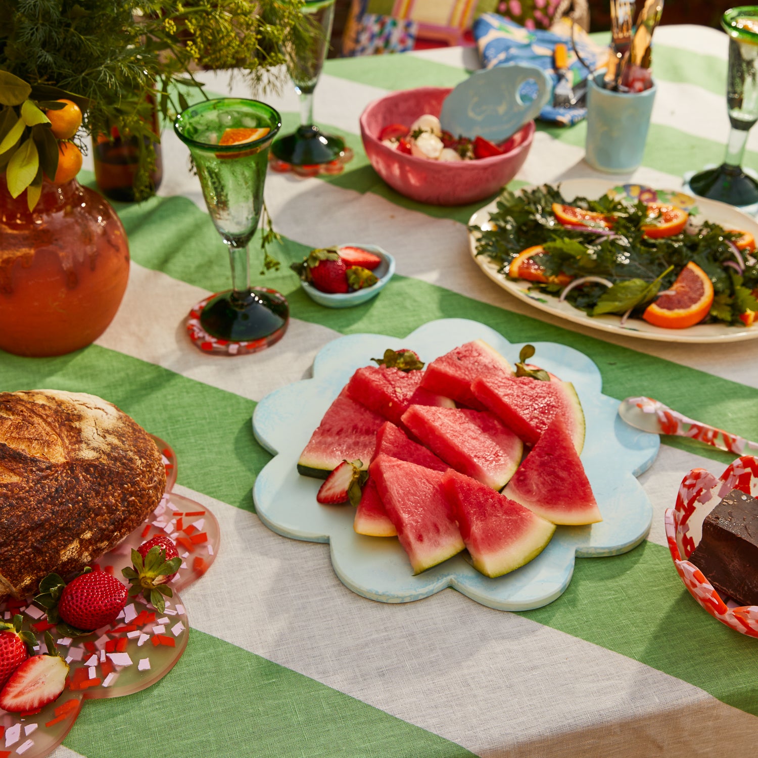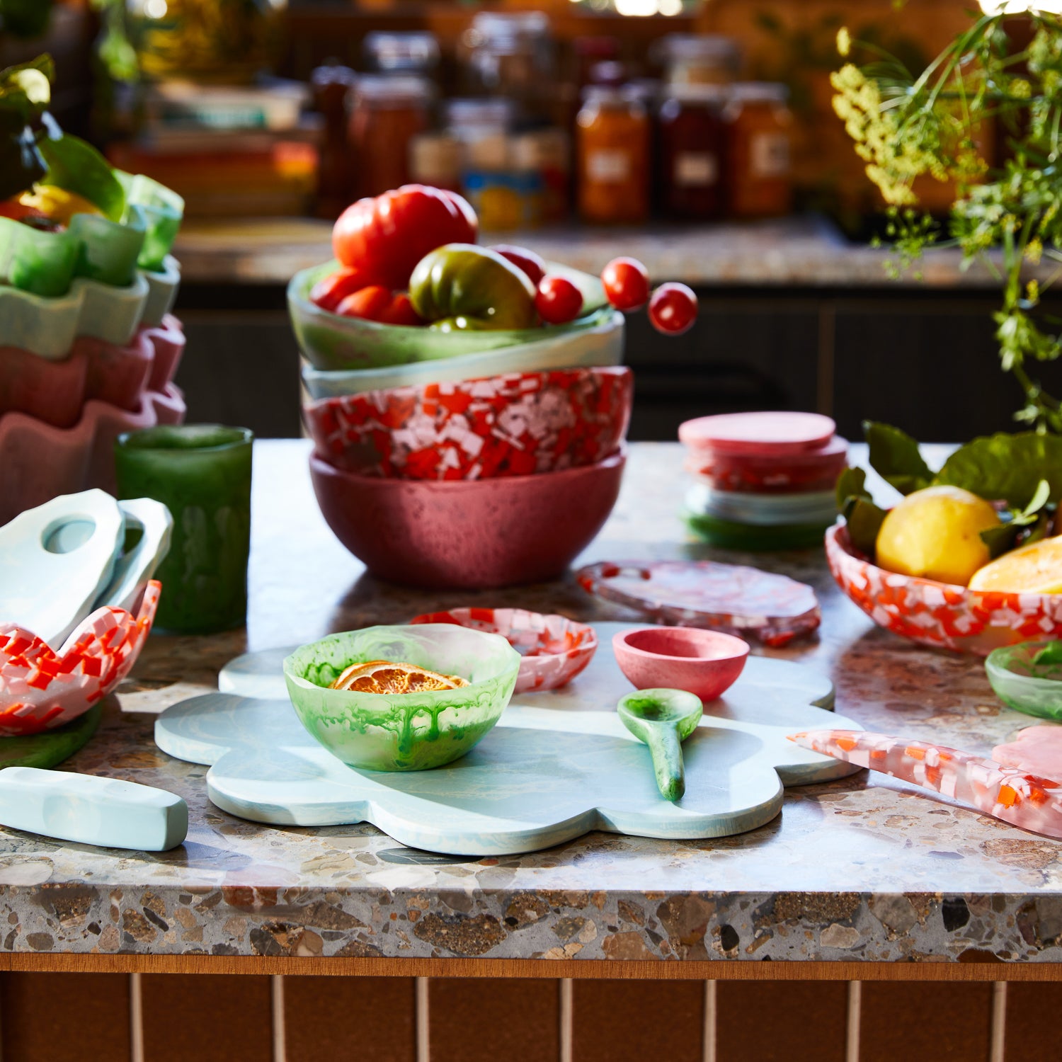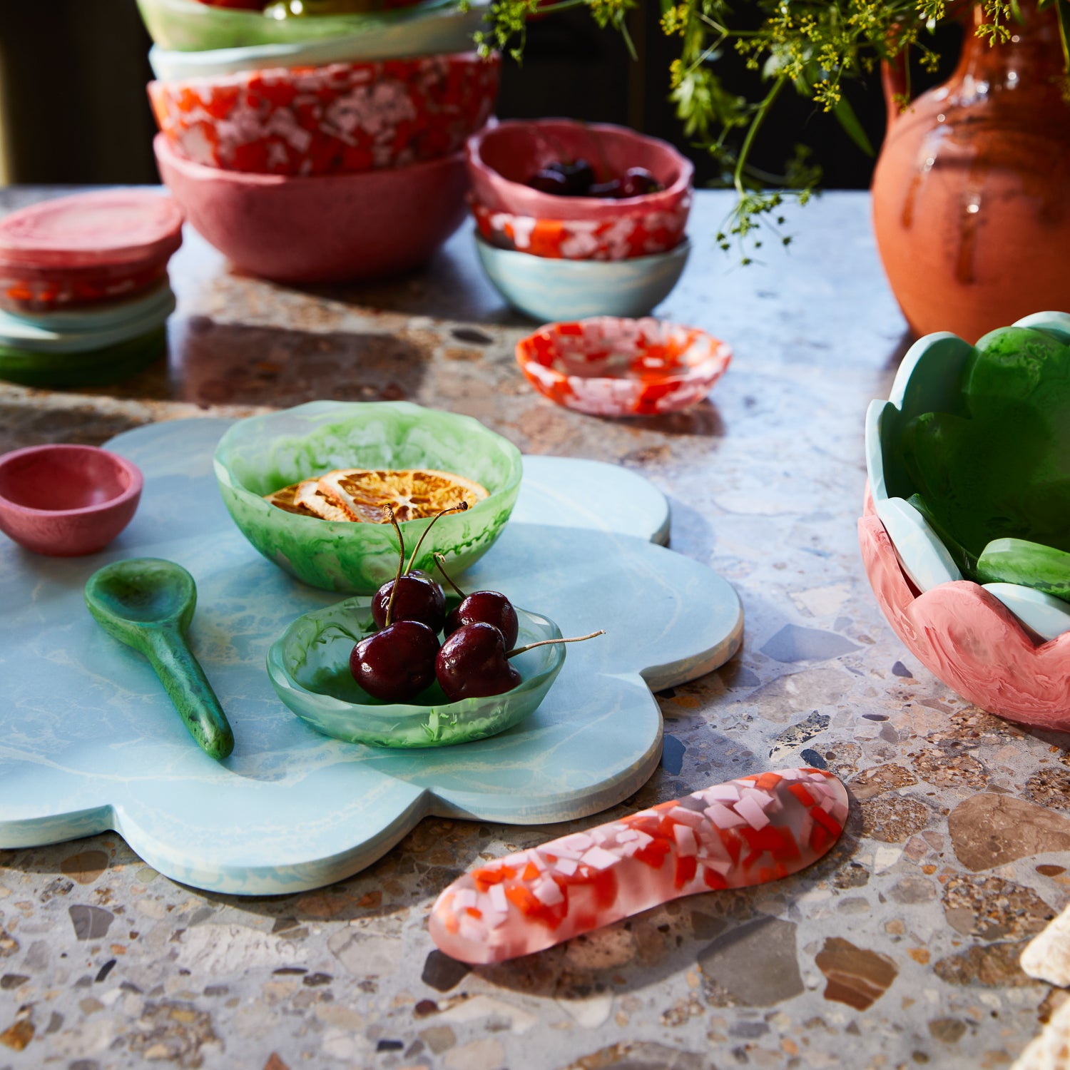 “Whether you’re entertaining or just enjoying daily dinners with the family, our resin tableware makes every meal an experience to remember. The Candice Board features scalloped edges to create a beautiful flower shape, bringing plenty of character and elegance to celebrations of all kinds. Imagined here in our stunning Confetti colourway – swirling together pops of pinks and orange with transparent resin to imitate classic terrazzo designs.” – Phoebe’s Style Notes