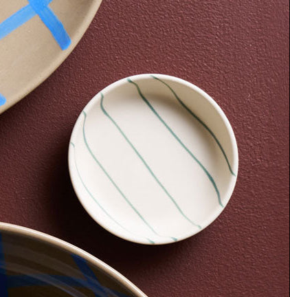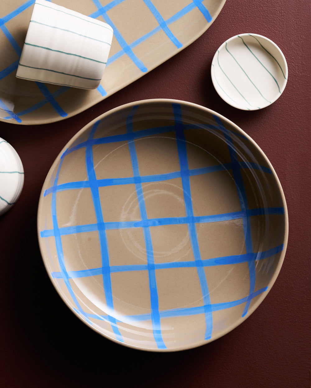 Large oval platters and shallow bowls create the perfect stage for shared meals, while condiment dishes add simple finishing touches. The carafe and latte cups stack neatly for easy storage, blending practicality with style. Available in a minimal linear stripe—these pieces are made to mix and match