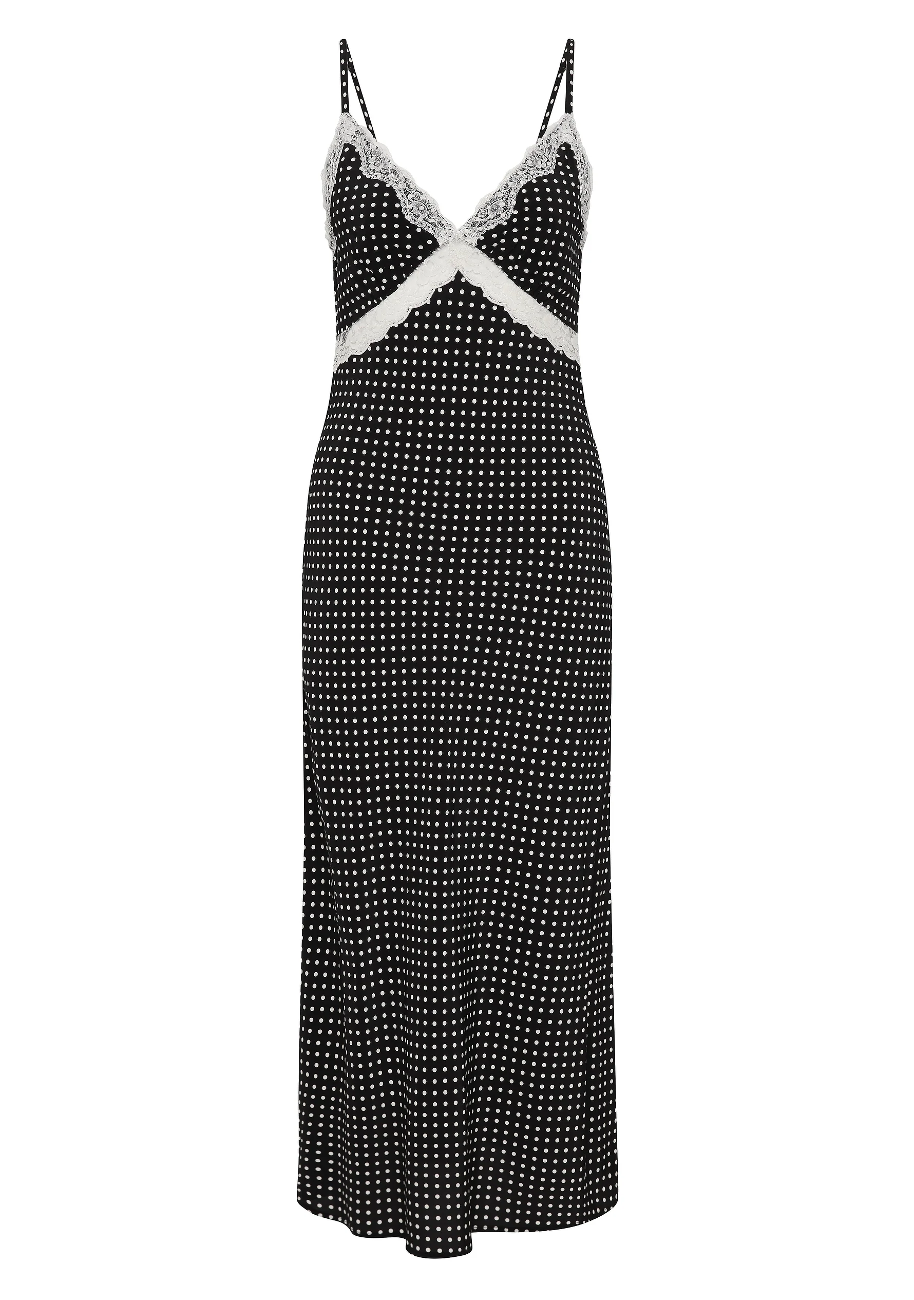 The Darlene Slip Dress in black polka with contrast cream lace is a timeless slip midi, designed with a flattering V-neckline, delicate lace inserts, and a softly gathered bust. Effortlessly feminine and ready for any event you throw at it, this dress is pure elegance.
