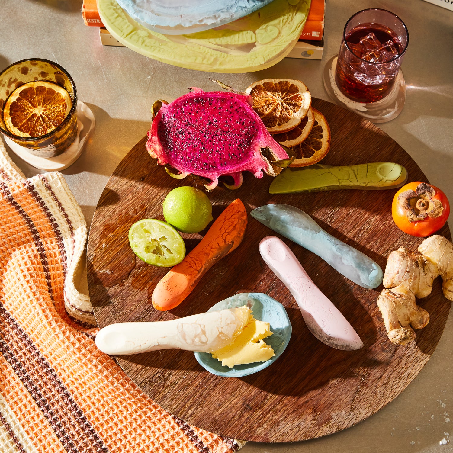 “The Frances Spreader Knife is carefully designed for serving pâté and spreads, or even your favourite gooey cheeses. Reimagined here in our stunning Vanilla colourway – swirling together a delicious cream and transparent resin for a bold statement.” – Phoebe’s Style Notes