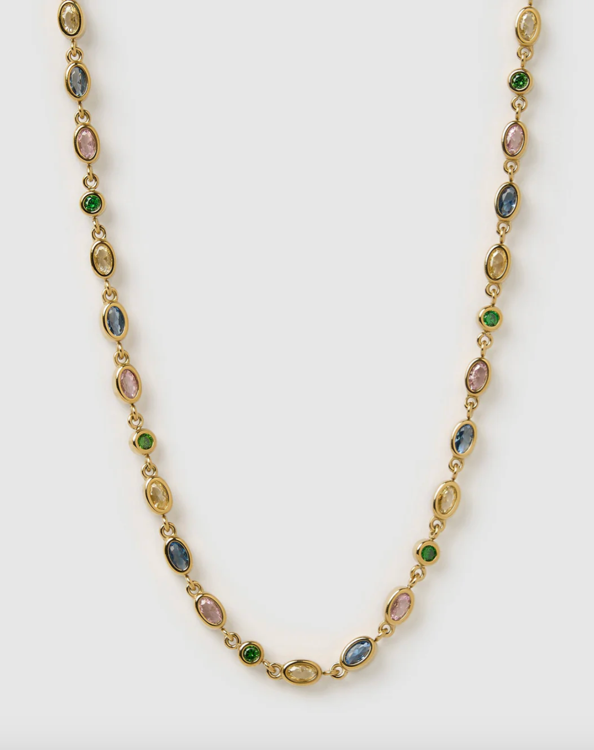 - A vibrant blend of elegance and sparkle, the Isadora Necklace is here to elevate every look. Featuring multi coloured zircon stones set in polished gold tone bezels, it is designed to shine beautifully as it shifts and moves naturally, giving you a refined shimmer throughout the day.