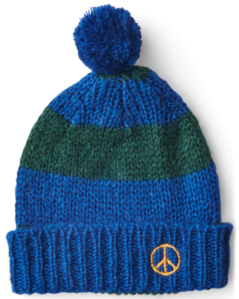 Keep those ears covered and noggins warm with the Trekker Knitted Beanie. Made with horizontal stripes of blue and green, an embroidered peace symbol and a blue pom pom on top.