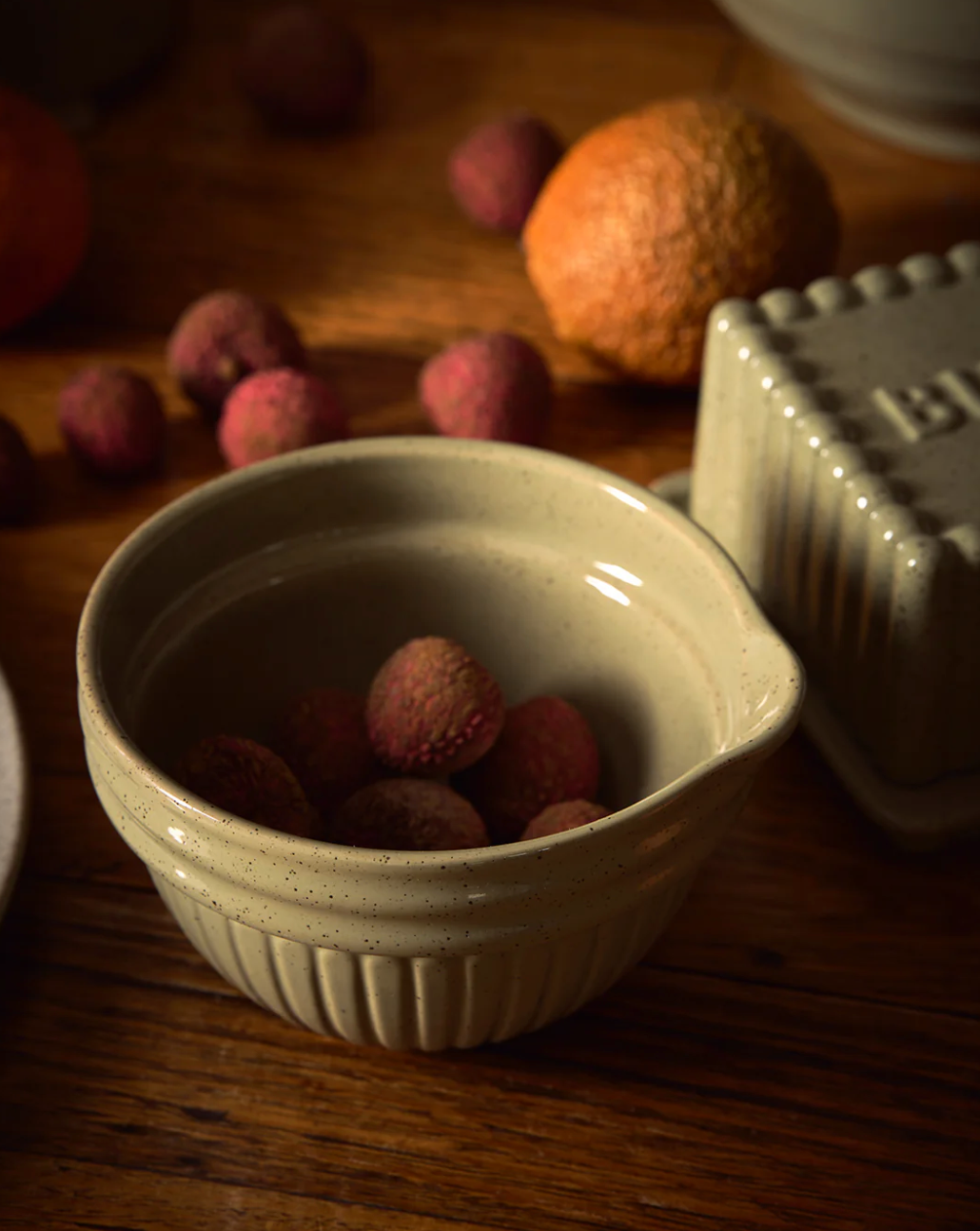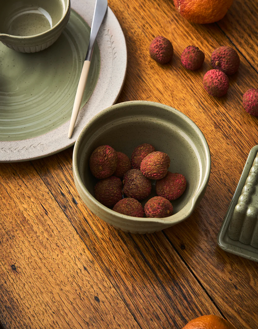 Inspired by the steady rhythm of the kitchen, this collection celebrates the beauty of daily preparation and time spent cooking. Subtle glazes and gentle leaf embellishment introduce softness and balance to everyday cooking, finished in a reactive glaze with delicate speckling.