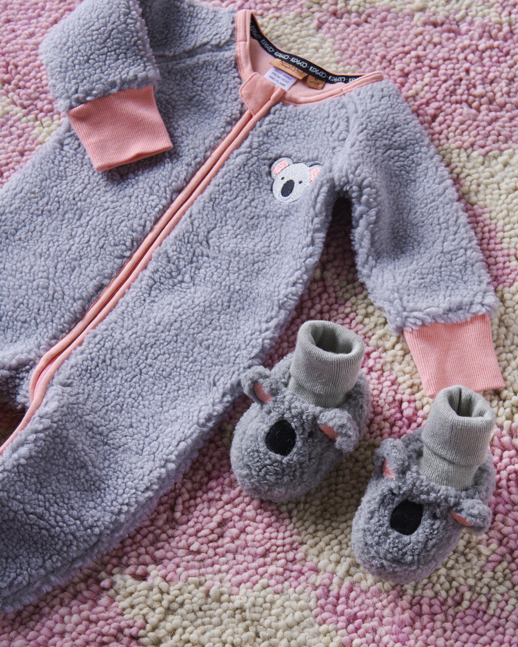 It's ooh's and ahh's all round with these heavenly Koala style booties, with a grey super soft sherpa Koala face with sweet fuzzy ears, and our classic bootie cotton sock style for a super secure fit.