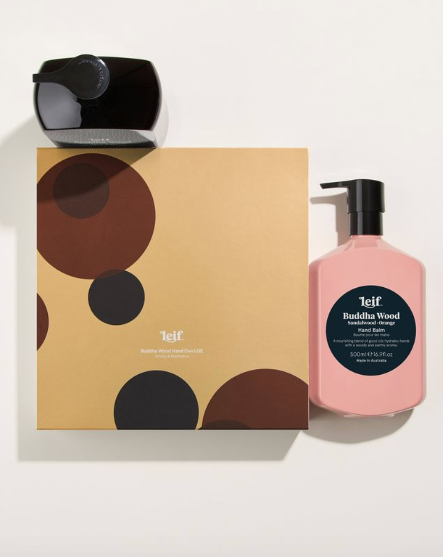 This gift set ties together Buddha Wood Hand Wash & Balm 500mL