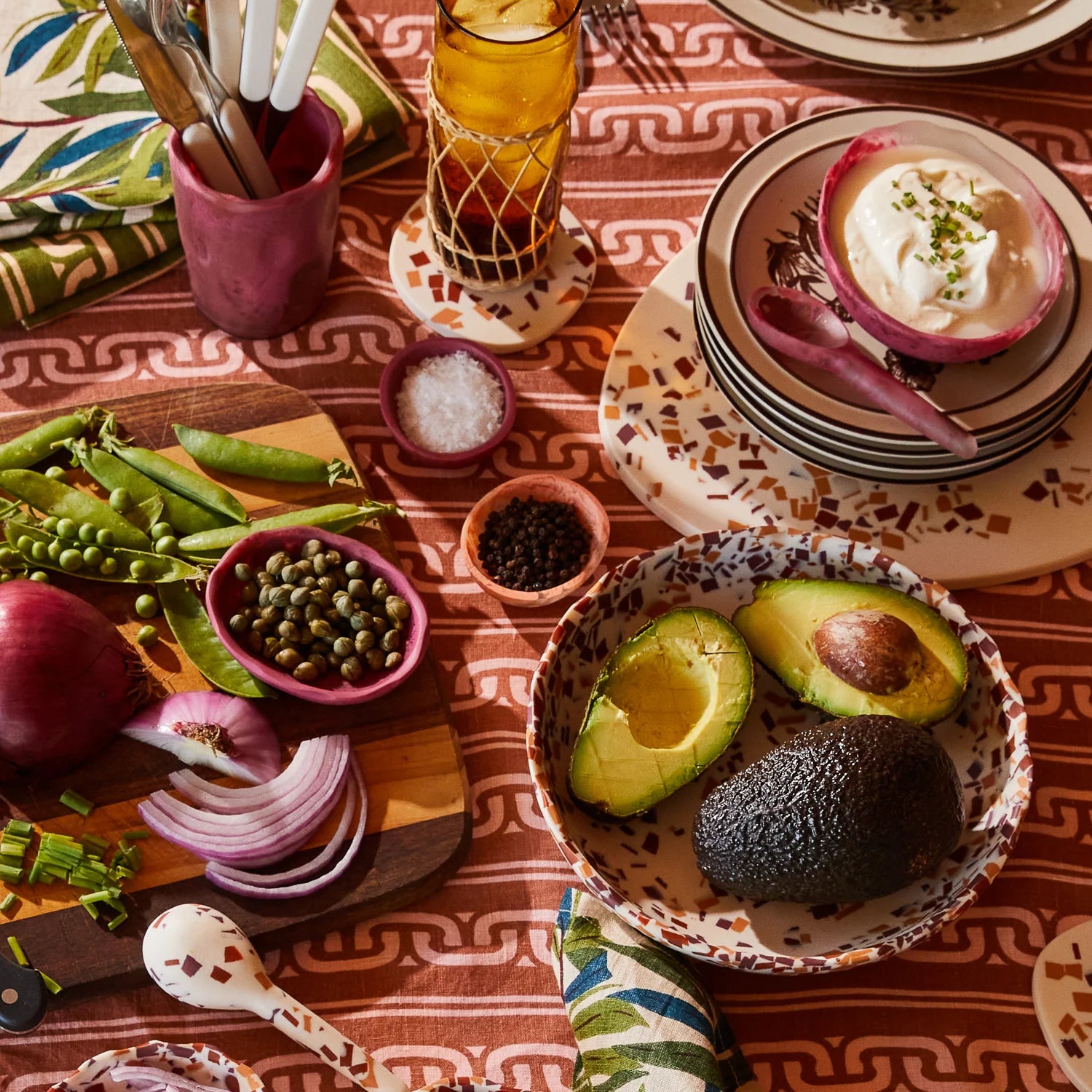 “The Suki Spoon is a beautifully designed, versatile piece that’s perfect for serving dips, olives and dollops of cream to top off afternoon scones. Reimagined here in our stunning Rhubarb colourway – swirling together burgundy-pink hues and transparent resin for a dramatic finish.” – Phoebe’s Style Notes